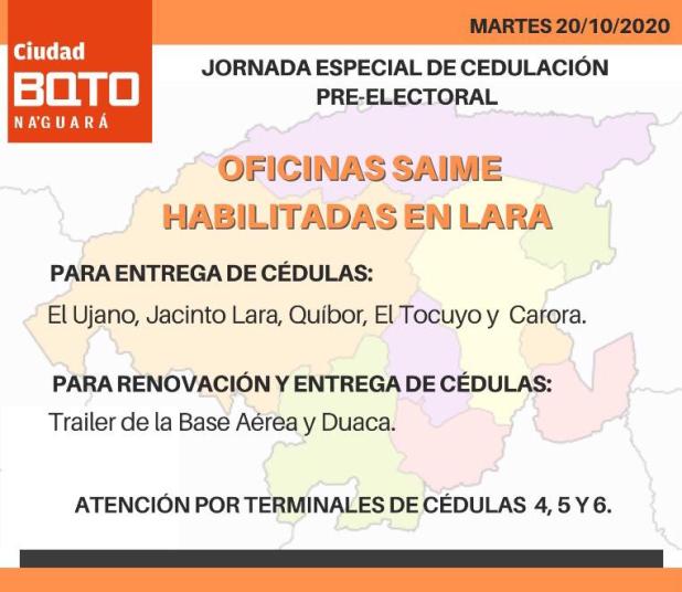CIUDAD BQTO. Este martes continúa en la entidad larense la Jornada Especial de Cedulación Pre-Electoral del Servicio Administrativo de Identificación, Migración y Extranjería (Saime), con entrega del documento en las oficinas El Ujano, Jacinto Lara, Quíbor, El Tocuyo y Carora.